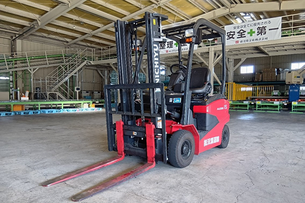 配達先の田川に到着後、フォークリフトで荷積みと荷卸しを行います
